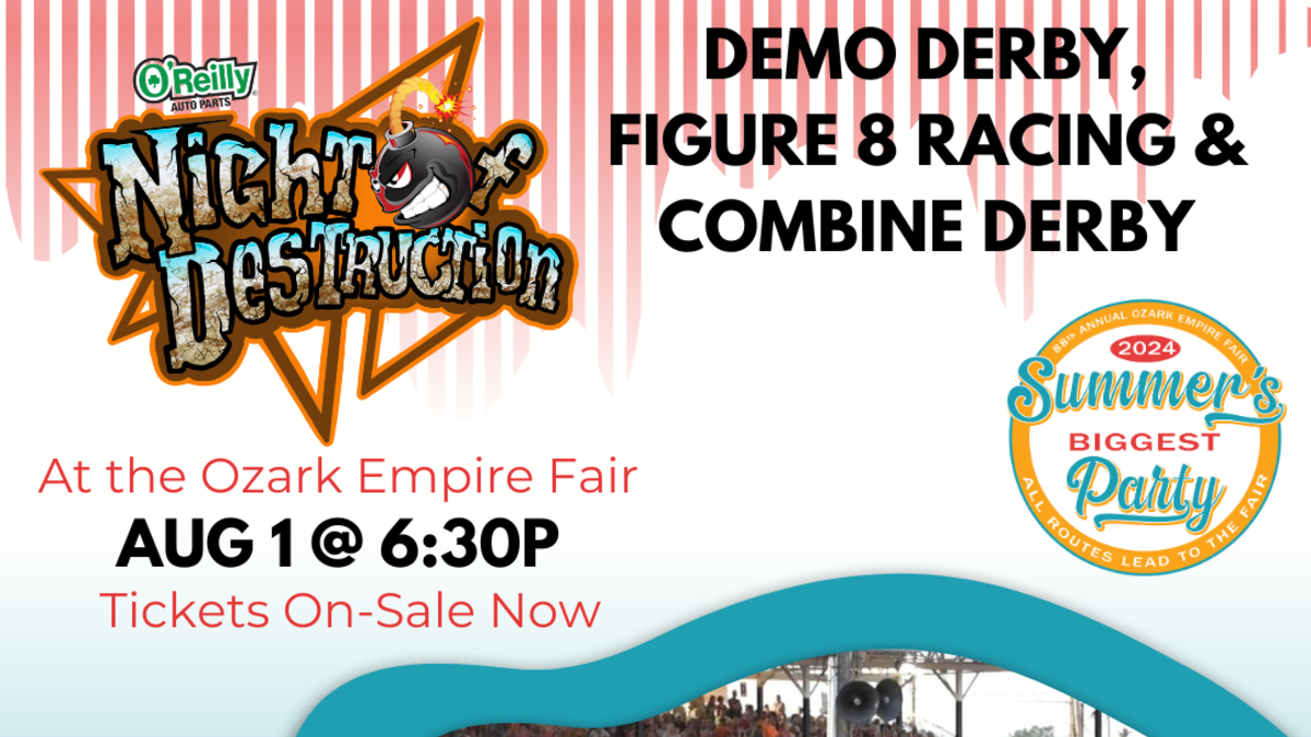 The O'Reilly Auto Parts Night Of Destruction demolition Derby, Figure 8 Racing, and Combine Derby is coming up at the Ozark Empire Fair Grandstand on August 1st! Gates open at 5:30pm and the show starts at 6:30pm. Get tickets now at Stubwire.com